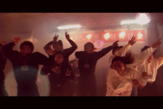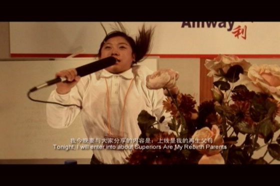 錄像裝置作品由八個頻道組成,分別是《超越自我》《集體造夢》《財富講壇》《分享淚水》《集體謀略》《絕對信任》《你不會死》《意亂情迷》,每個部分片長2-3分鐘。錄像內容全部來自安利Amway駐中國公司的員工培訓科目。錄像的表演者全部是來自雜技團的演員,他們處于顛倒的狀態中進行表演,在后期錄像編輯時,再把畫面做顛倒處理,看上去仍是“正常”的培訓活動。