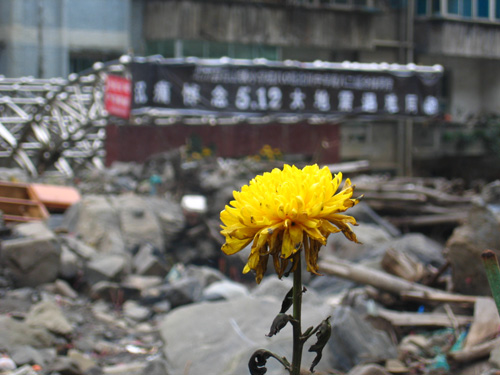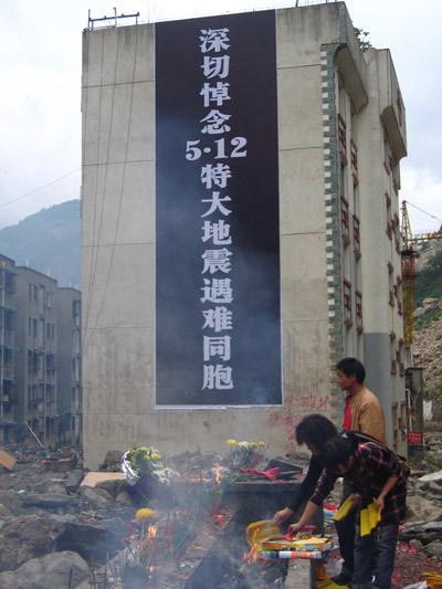災難過后,陸續(xù)有一些當?shù)厝嘶氐嚼峡h城,祭奠自己的親人、朋友、同事。廢墟之上,到處可以看到人們祭獻的鮮花、蠟燭。北川,注定成為我們生命中無法忘卻的烙印。