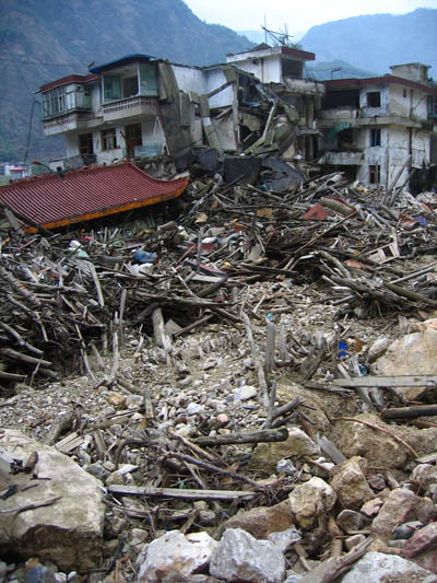 走進城里,原本有些嘈雜的隊伍變得安靜起來。除了不多的幾聲感慨,這里只有可以填滿數(shù)個房間的巨大落石、扭曲傾斜的樓房和變?yōu)橥叩[的民居,散落、堆砌在坎坷不平的道路兩旁,訴說著曾經(jīng)的巨變。