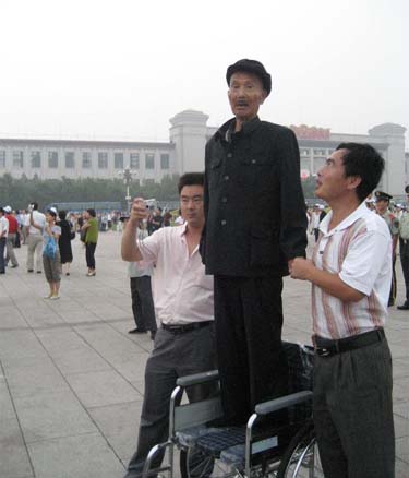 老人竟然如此筆直地站在病殘者專用工具上,是什么力量讓他忘卻弱病,以最莊重的姿態站立。顯然,他朝著天安門的方向,顯然這是一個陰天或者清晨的時刻,或者他在看激動人心的升旗儀式,或者他在眺望天安門城樓上偉大的領袖像。或者,他的目光已經穿過了高大的城墻和宮殿,直達年青的麥穗和凄苦的歲月,直達或許已經先走一步的老伴。