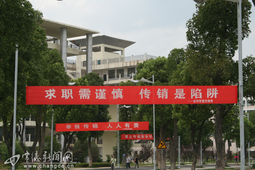 校園內(nèi)懸掛著打擊傳銷的橫幅