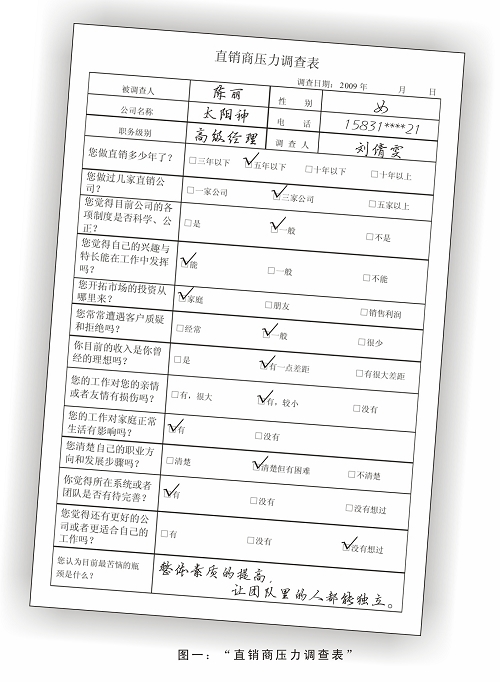 綜合三種調查形式,本次調查共收到有效問卷 3623份,大家從自己的工作和生活實際出發,將自己的感受真實地反饋給了我們(見圖一“直銷商壓力調查表”),為本專題提供了客觀、真實的原始數據。這里,本專題全體人員特別向為此做出貢獻的人表示真誠的感謝。因為他們的真誠回答,不僅使我們這個專題得以圓滿進行,也為廣大直銷人認清自己的生存狀態,消融和避免事業壓力做出了貢獻。