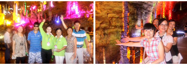 游覽享有“世界溶洞全能冠軍”之稱的黃龍洞景區,伙伴們再一次被大自然深深震撼:洞中燈火闌珊、石筍林立,猶如一株株古木錯節盤根、洞中有洞、洞中有河、無奇不有,真乃名副其實的“地下魔宮”! 洞內有迷宮、響水河、天仙水、天柱街、龍宮等六大景區,長廊蜿蜒,鐘乳懸浮,石柱石筍林立,還有石簾、石幔、石花、石琴,琳瑯滿目,異彩紛呈。更讓人感到新鮮別致的是那色澤,紅、藍、青、綠、黃、白、紫,重重疊疊,絢麗多彩,滿目珠璣,令人眼花潦亂。山的腹地,濃縮著如此美麗的景致,被精雕細刻的如此晶瑩、閃亮,伙伴們被這種神奇的力量所感染,靜靜地欣賞著,不錯過任何一處的精彩。