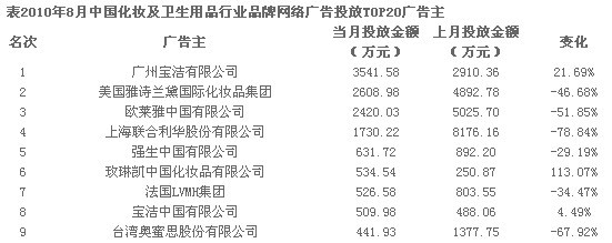 根據Enfodesk易觀智庫研究顯示,2010年8月,化妝及衛生用品品牌網絡廣告投放規模停漲下跌,環比下降45.1%。隨著夏季進入8月尾聲,各大廣告主的主要夏季產品均已進入銷售尾期,秋季新品尚未大幅推廣的情況下拉低本月化妝及衛生用品行業網絡廣告投放規模跳水近半。