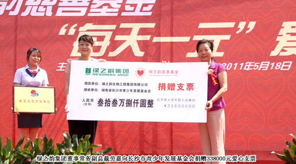 感恩五月,綠之韻人用實際行動再一次傳遞愛心。2011年5月18日,綠之韻集團“激情五月 夢想嘉年華”活動現場,綠之韻慈善基金“每天一元”的慈善倡議活動得到了社會各界、集團領導、綠之韻員工、經銷商的熱情參與。共青團長沙市委副書記詹萍萍、長沙市青少年發展基會理事長羊舒麟、長沙市青少年發展基會秘書長李璐璐、綠之韻集團董事長胡國安、董事常務副總裁勞嘉、執行總經理龔振、沙棘產業事業部總裁王鐵柱、女性健康產業事業部總裁譚正、低碳產業事業部副總裁兼市場總經理張晉崧等集團及各事業部的領導出席本次活動,并在現場積極捐款,傳遞愛心。