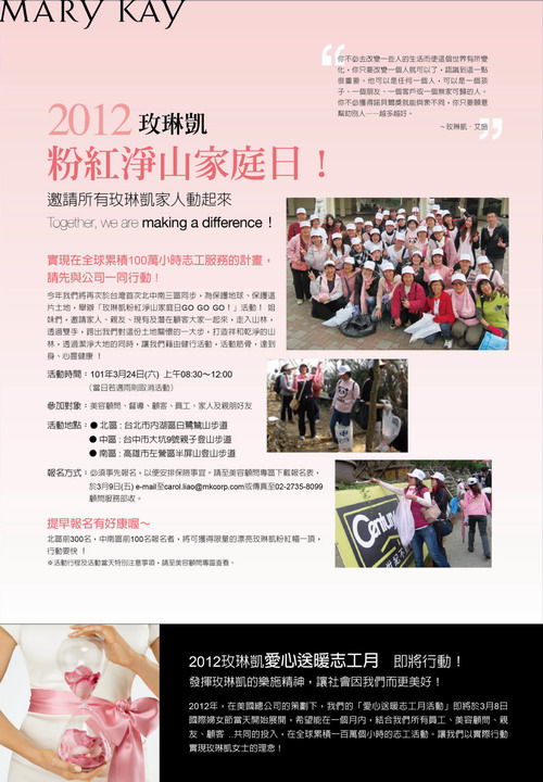 為了慶祝國際婦女節(jié),玫琳凱公司、玫琳凱獨立美容顧問以及員工將團結(jié)在一起,從2012年3月8日到4月8日,參與〝玫琳凱愛心送暖月〞,把時間當(dāng)作一份愛的禮物,一同努力,我們將可以在世界創(chuàng)造美麗的改變。 志愿服務(wù)可以以任何方式表現(xiàn):