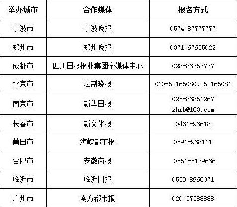 2012三生“高考愛(ài)心直通車(chē)”各城市合作媒體及愛(ài)心車(chē)主報(bào)名和考生預(yù)約熱線如下: