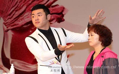 在培訓現場,除了有精彩的產品講解外,更邀請到國內著名時尚造型師、美妝護膚專家張瀚一先生親臨現場,引爆全場氛圍。在臺上,張瀚一先生告訴大家“美麗其實很簡單”,并即興邀請了一位現場伙伴,在示范粉底液和唇膏上妝手法的同時,用短短幾分鐘時間,為她美麗大變身,成為了舞臺上矚目的璀璨之星。美顏產品效果的即時呈現,令全場為之震撼,掌聲雷動。