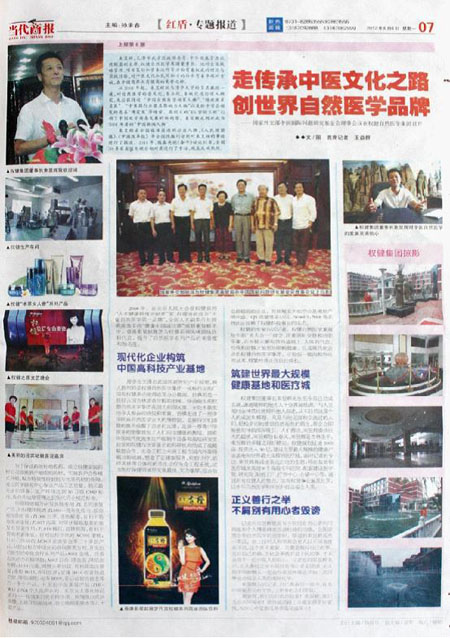 2012年8月6日,《當代商報》“紅盾”特刊刊登《走傳承中醫文化之路 創世界自然醫學品牌—國家外交部中國國際問題研究基金會理事會議在權健自然醫學集團召開》的專題報道。