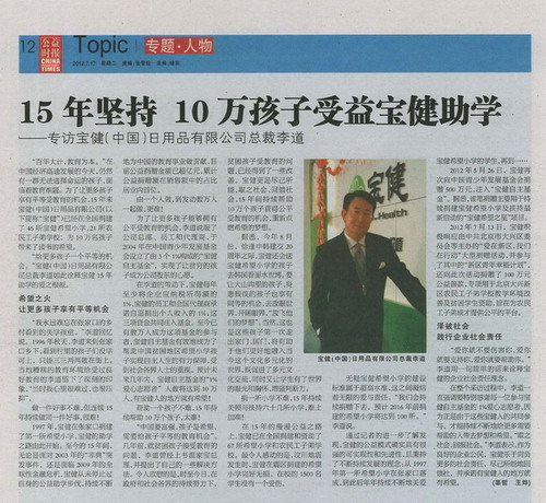 在整個采訪過程中,李道一直強調要特別感謝每一位參與寶健自主基金的1%愛心志愿者,因為正是由于這些寶健人的共同參與,才能持續不斷地給更多需要幫助的人帶去夢想和希望。“取之社會,回報社會。”李道表示,作為良好的企業公民,寶健樂于肩負更多的社會責任,盡己所能地回饋社,并承諾有寶健人的地方就有希望。