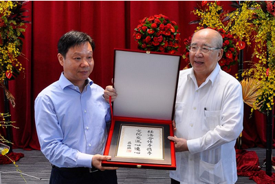 吳伯雄主席與克緹國際集團總裁陳武剛博士還先后與上海參訪團代表交換了象征友好往來的禮品。吳伯雄主席將親筆書寫的“經濟合作手攜手,文化交流心連心”的紀念匾贈與上海參訪團,希望雙方以此共勉,共促繁榮。陳武剛博士也將名為“勇傳云霄”的琉璃收藏品贈送給上海參訪團。作品以臺灣蘭嶼島最知名的獨木舟和飛魚祭為主要設計意象,寓意輝煌的未來。陳武剛總裁特地挑選此件琉璃作品,除了富有濃厚的臺灣特色之外,更藉此祝福上海發展得越來越好,實現經濟上的持續騰飛。