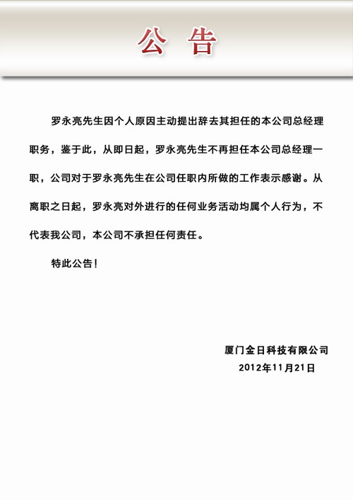 附:廈門金日科技有限公司公告