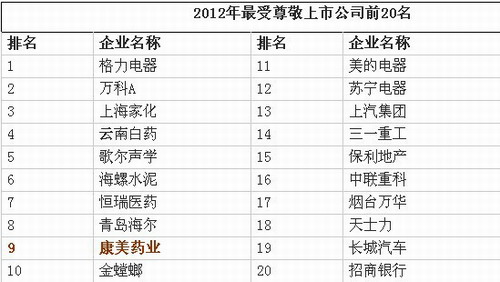 12月24日,由70家公募和5家主要的私募基金公司的200位基金經(jīng)理評(píng)出的2012年50家最受尊敬上市公司名單出爐。康美藥業(yè)股份有限公司(600518)以較強(qiáng)的競(jìng)爭(zhēng)優(yōu)勢(shì)進(jìn)入前十,排名第九位,相比去年的第47位排名,足足提高了38個(gè)名次。