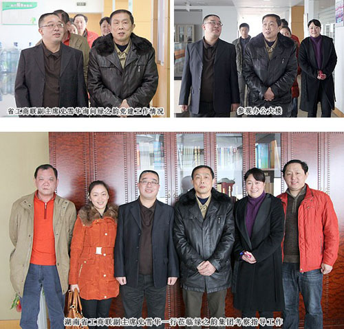 2013年1月18日下午,湖南省工商聯副主席史雪華、省工商聯扶貧處處長甘露一行蒞臨綠之韻集團考察指導工作。在視察過程中,綠之韻集團董事長胡國安、董事常務副總裁勞嘉陪同領導參觀了綠之韻集團總部,從綠之韻多功能產品形象展示廳、到黨建工作宣傳欄、再到企業榮譽墻,胡國安董事長仔細介紹,省工商聯副主席史雪華一行時而駐足,時而詢問,頻頻點頭以示肯定和贊許。