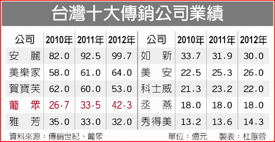 直銷博客網(wǎng)訊,據(jù)直銷世紀(jì)統(tǒng)計(jì),2012臺灣十大直銷公司仍由安利以99.7億元(約合人民幣19.94億元)坐穩(wěn)業(yè)績第一寶座,而以新生代挑戰(zhàn)者之姿搶進(jìn)第四的葡眾,則以年增率26%奪冠。法人推估,葡眾不僅挹注母公司,讓葡萄王去年締造EPS約4.8元(約合人民幣0.96元)的歷史新高紀(jì)錄,葡眾EPS更挑戰(zhàn)300元(約合人民幣60元)。
